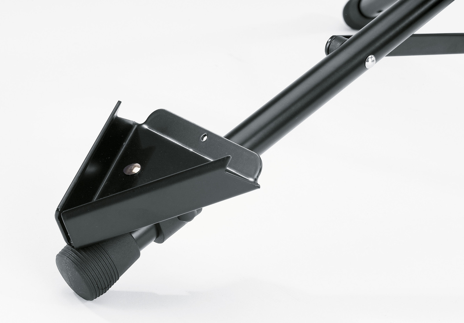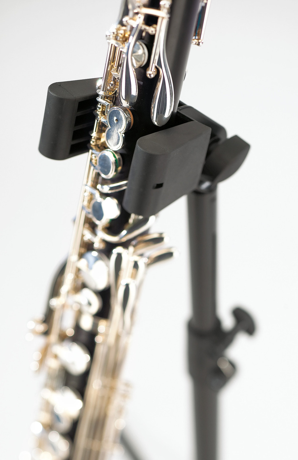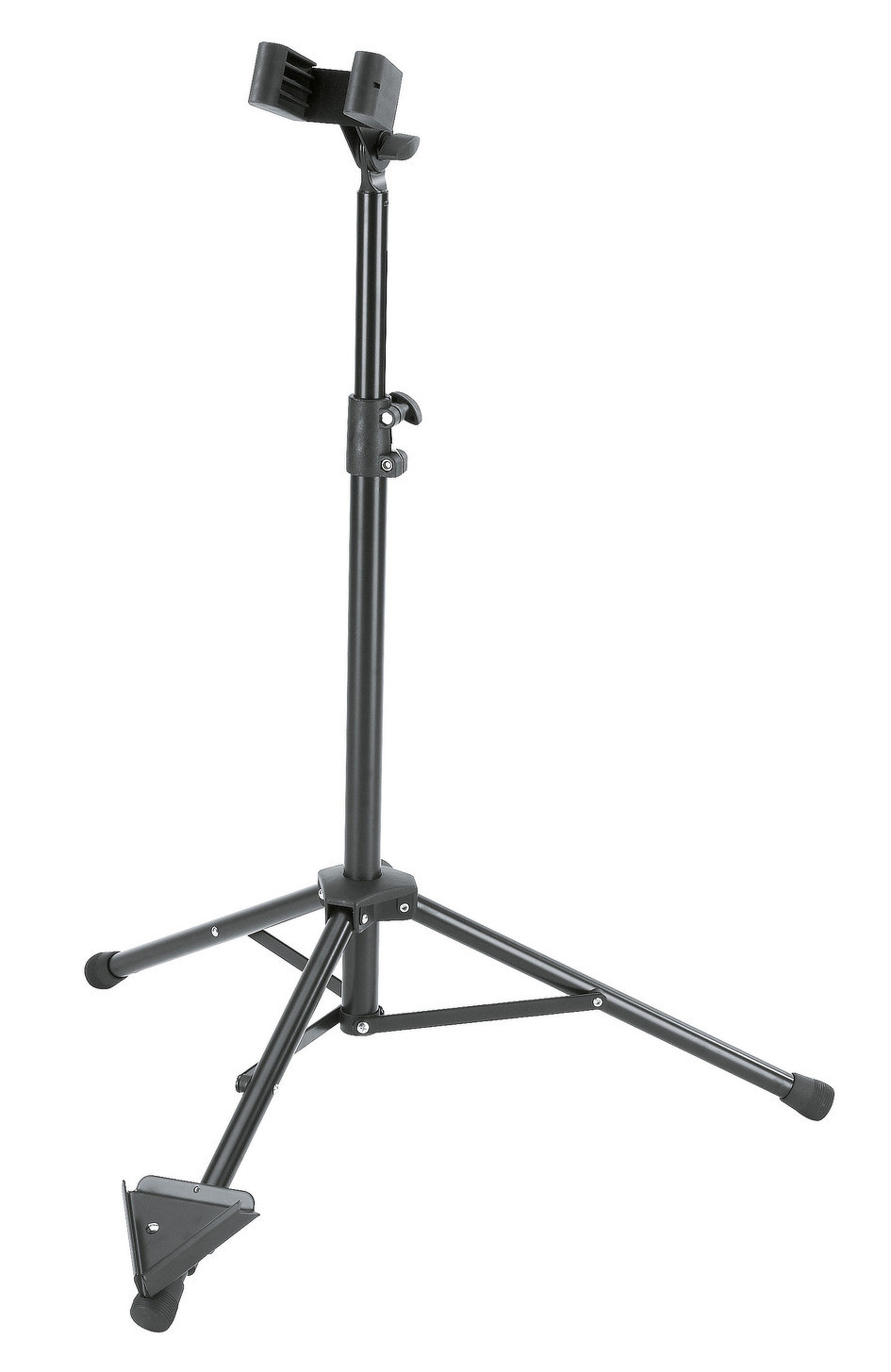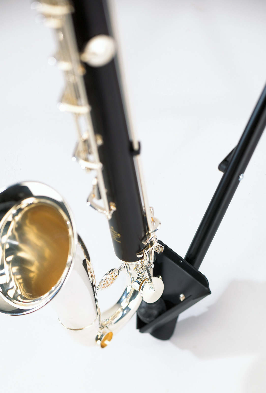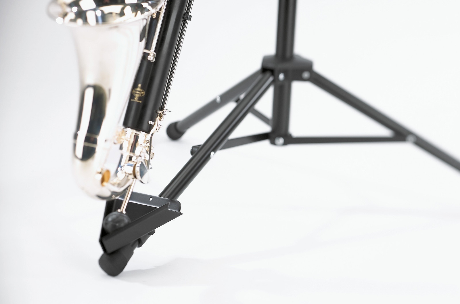 Skládací ocelový stojan na bass klarinet. U podpěry pro nástroj lze nastavit náklon a šířku. Univerzální podpěra se přizpůsobí různým rozměrům nástroje pomocí odnímatelných gumových podložek. Jednoduché umístění nástroje do držáku ve tvaru písmene V. Výška 700/1200 mm. Vyrábí se v černé barvě.