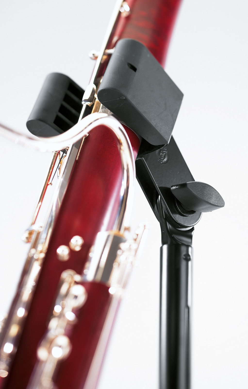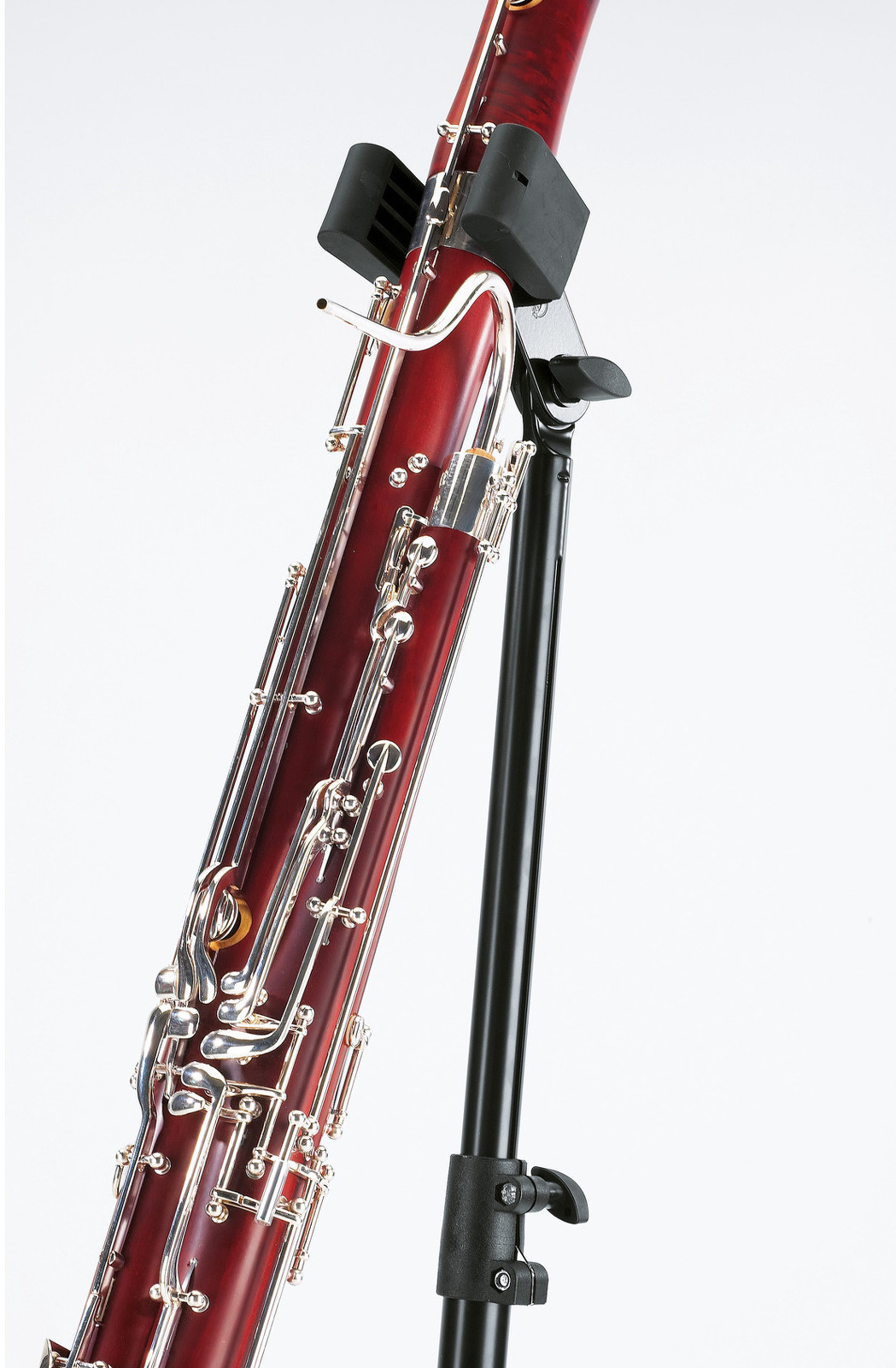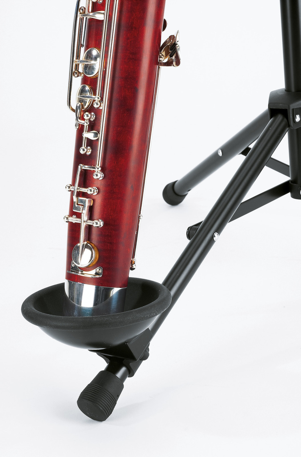 Ocelový stabilní stojan na fagot v novém designu. U podpěry pro nástroj lze nastavit náklon a šířku. Stojan je opatřen ve spodní části nohy nastavitelným gumovým košíkem pro zajištění opory nástroje. Výška 700/1200 mm. Vyrábí se v černé barvě.