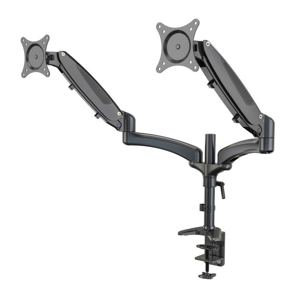 Držák na 2 monitory. Vhodný pro monitory do velikosti 32". Robustní hliníková konstrukce s integrovanou plynovou pružinou. Nosnost každého ramene až 8 kg. Připevňovací desky je navrženy pro velikosti VESA 75/75 a 100/100. Držák se připevňuje k desce stolu pomocí svorky s upínacím rozsahem tloušťky desky do 85 mm. Rychlá instalace. Nastavní výšky prostředního držáku do 200 mm. Vnější ramena lze nastavit do výšky 350 mm. Každou hlavu lze plynule naklánět a otáčet podle potřeby. Integrované umístění kabelů zaručuje čistý pracovní prostor. Vyrábí se v černé barvě.
