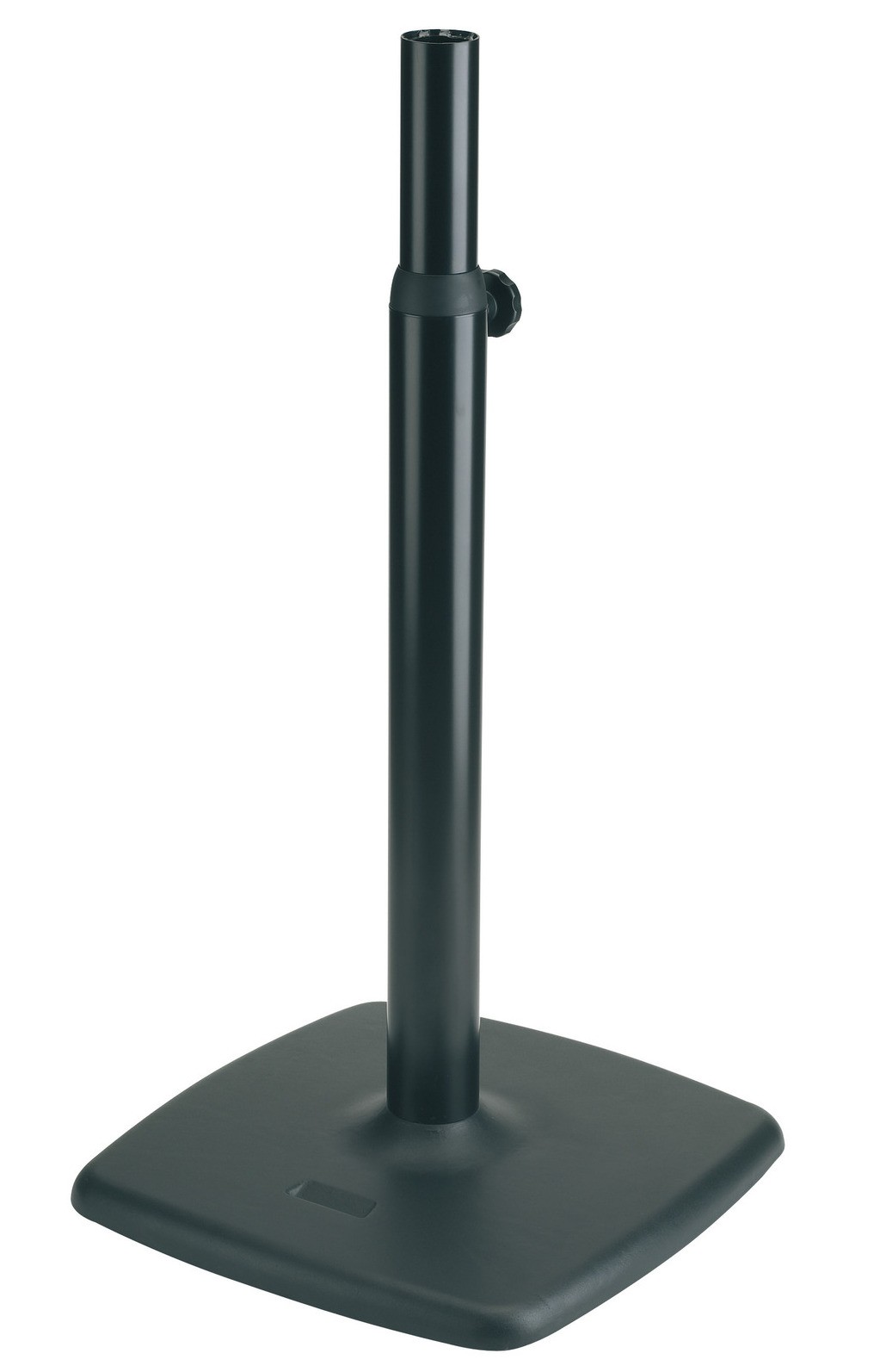 Ocelový výsuvný reproduktorový stojan s litinovým podstavcem. Výška stojanu 800/1350 mm, rozměry podstavce 480 x 480 mm. Postupné nastavení výšky pomocí upěvňovacího šroubu. Montáž reproduktoru se provádí na tři různé typy nosných desek 26792. Vyrábí se v černé barvě.