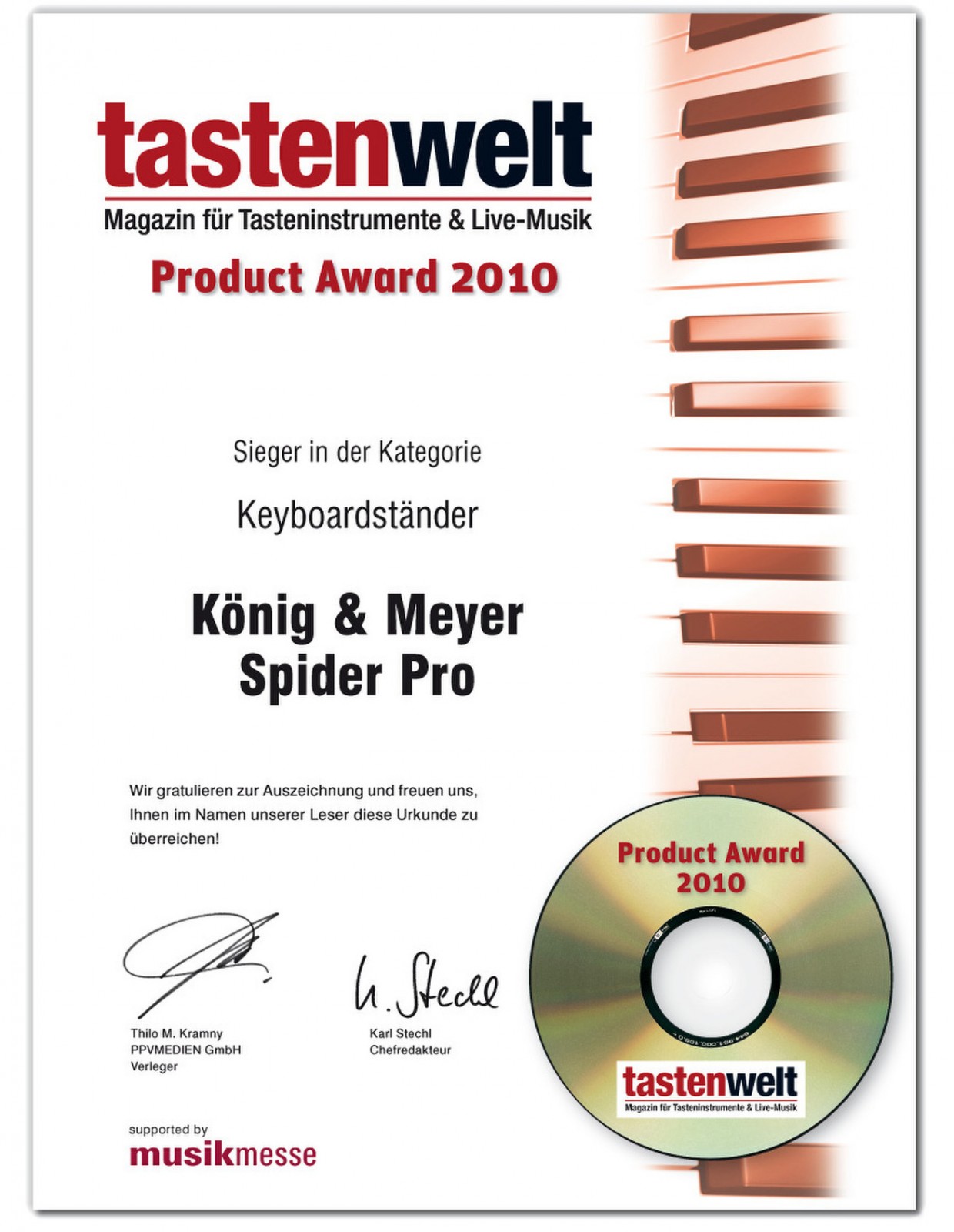 Hliníkový stojan na klávesy »Spider Pro« se dvěma páry výsuvných ramen s 15° úhlem náklonu. Může být doplněn o další pár ramen pro třetí klávesy. Nosnost ramena 35 kg. Výška stojanu 1310 mm. Stoján má závit 3/8" nebo 5/8" pro uchycení držáku mikrofonu. Plynule výškově nastavitelný s vyvýšenou konstrukcí nohou. Vyrábí se v černé, stříbrné a červené variantě.