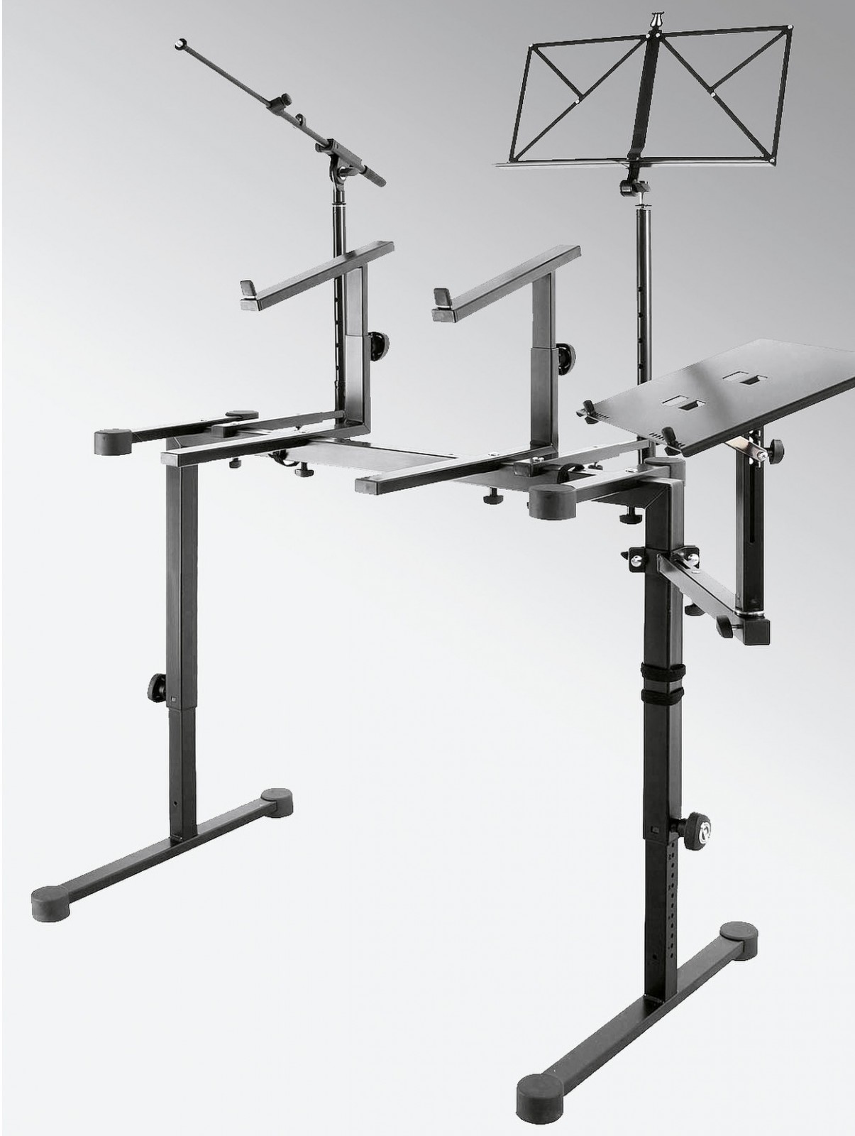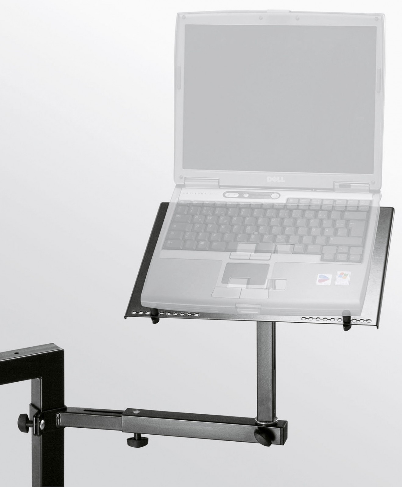 Přídavný držák na laptop ke stojanu na klávesy »Omega« 18810, 18950 a 18953. Nastavení držáku do 8 různých poloh, Může být připevněn k noze stojanu na klávesy. Vyrábí se v černé barvě.