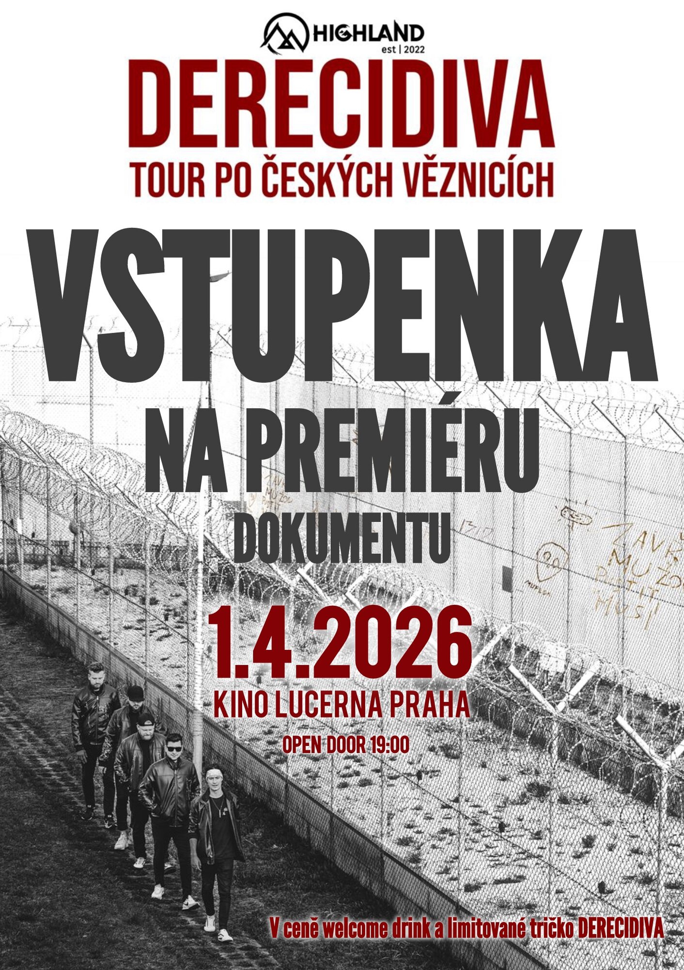 1. dubna 2026 se v Praze v velkém kinosálu v Lucerně odehraje dlouho očekávaná premiéra dokumentu DERECIDIVA kapely HIGHLAND. Dokument byl točen v rámci speciálního turné po věznicích a vznikal takřka 2 roky. Kapela se vzhledem k zájmu svých posluchačů rozhodla dát do prodeje pouze 50 vstupenek na tuto uzavřenou akci. Pokud chcete být první, kteří dokument spatří, udělat si hezký večer ve VIP společnosti a odnést si k tomu i speciální artefakt v podobě trička DERECIDIVA, máte teď možnost.